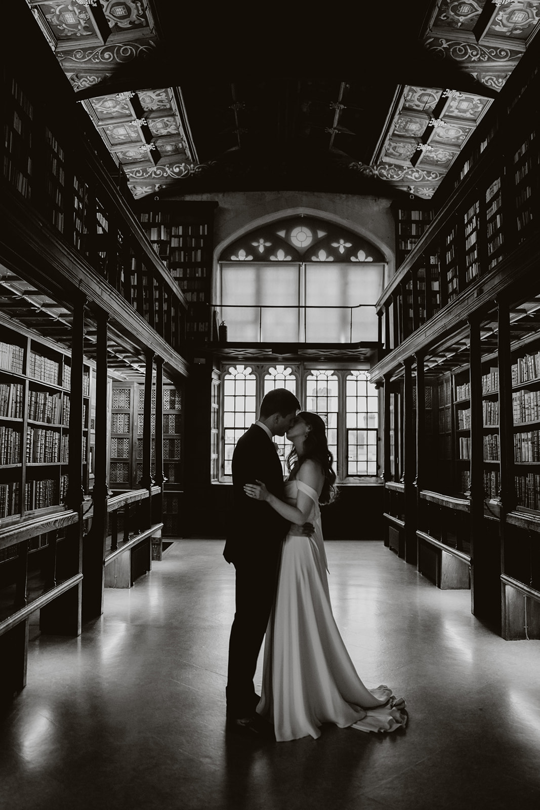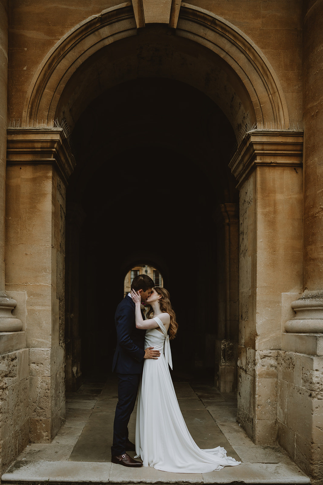 Wedding couple kissing in the Bodleian library in Oxford in front of the Radcliffe camera