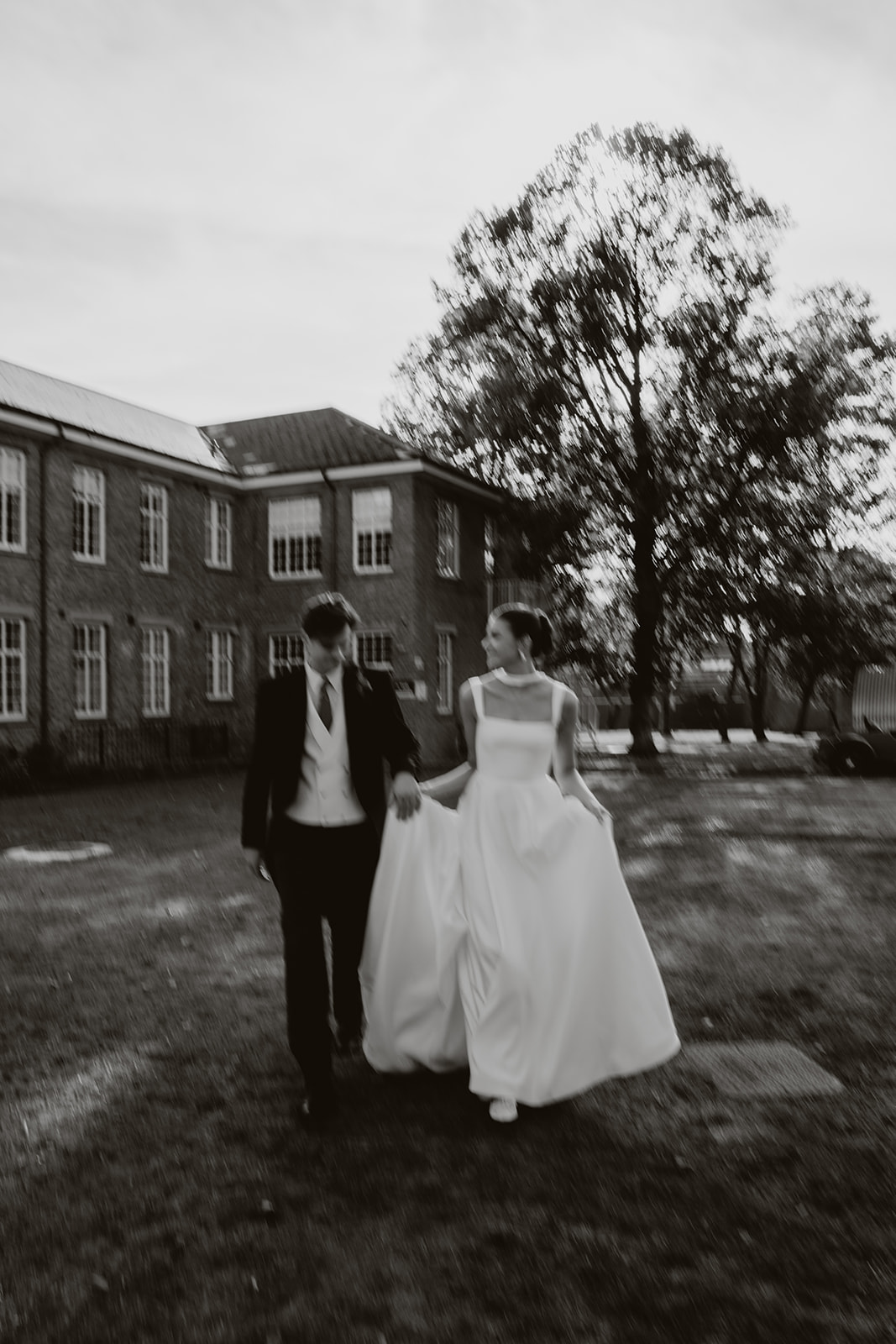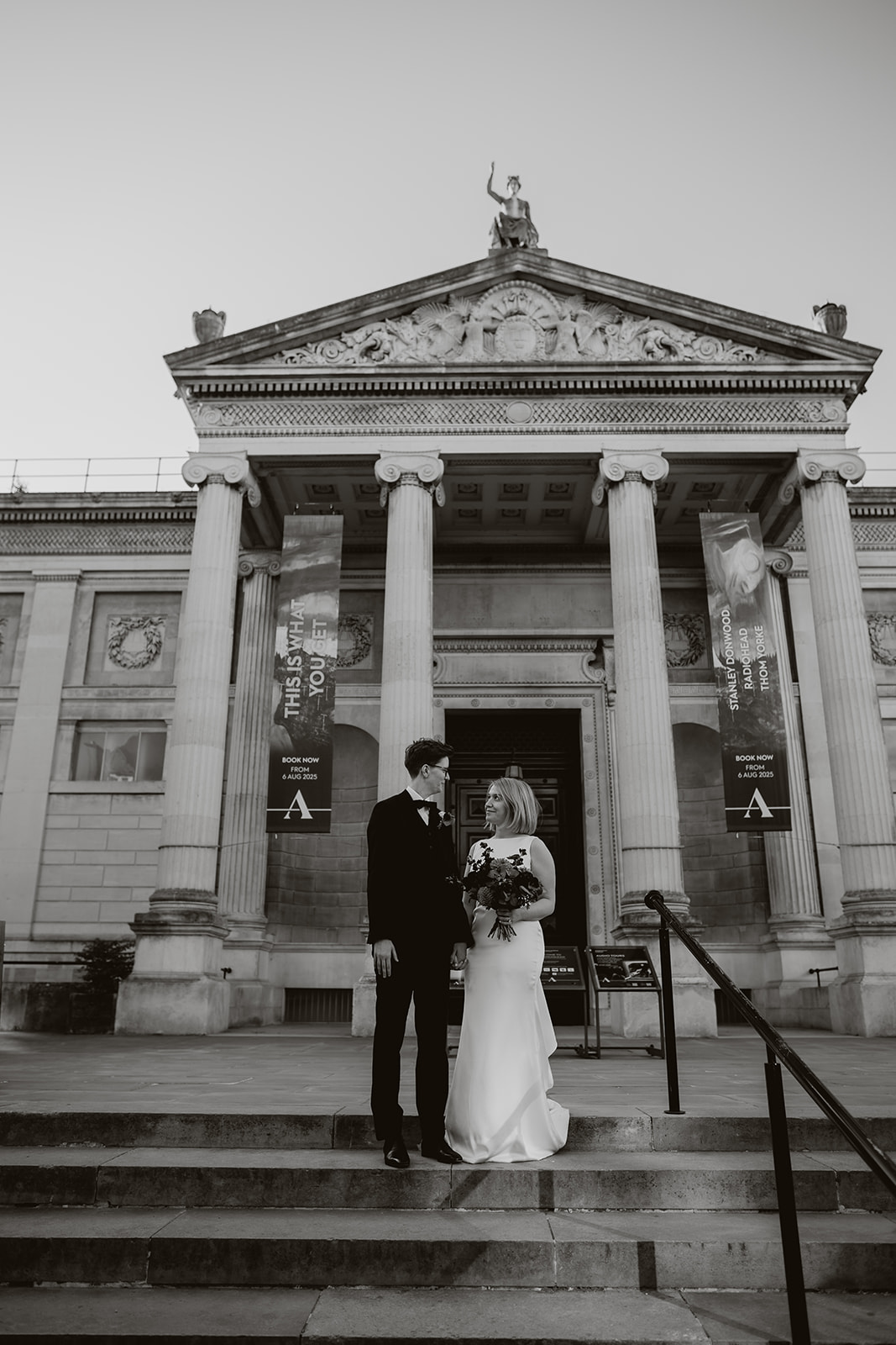 Wedding couple outside of the natural history museum in oxford in black and white