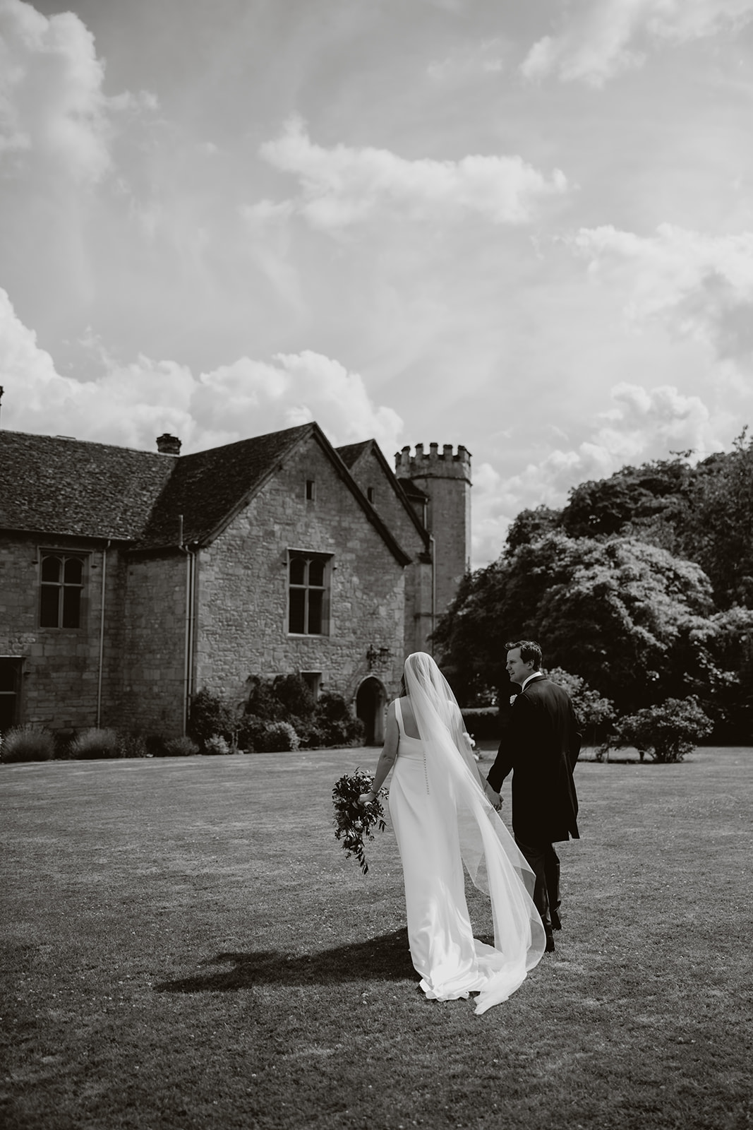 Black and White images of couple walking up stairs at Blenheim Palace Formal Gardens in Oxfordshire